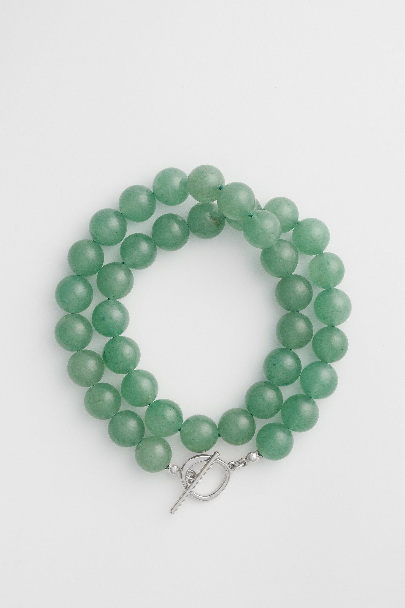 10mm Green Aventurine beads, natural and un-dyed, thread by hand on silk. Platinum plated brass toggle closure and findings. Lead and cadmium free, nickel safe. Approx 44cm in length.