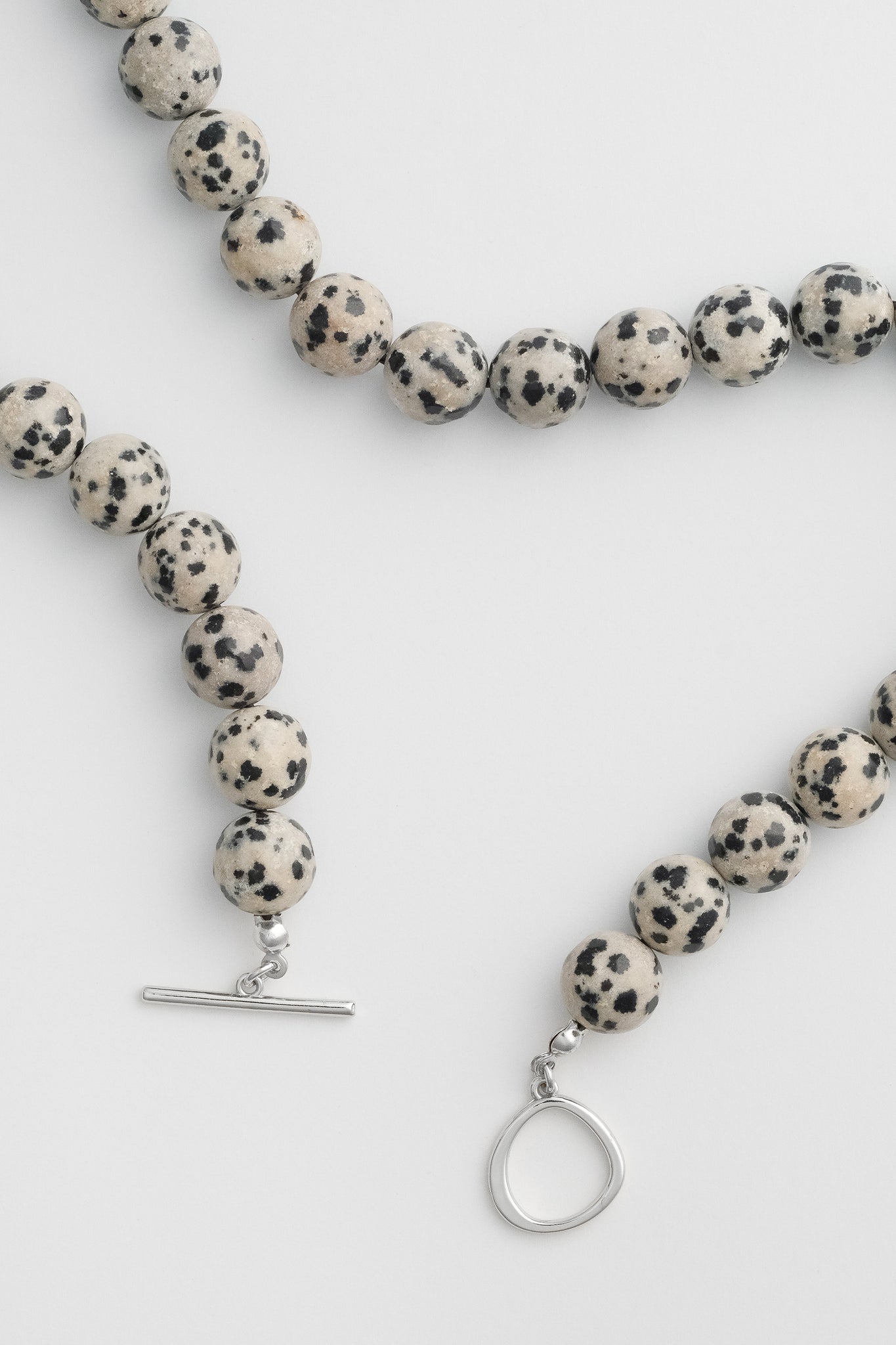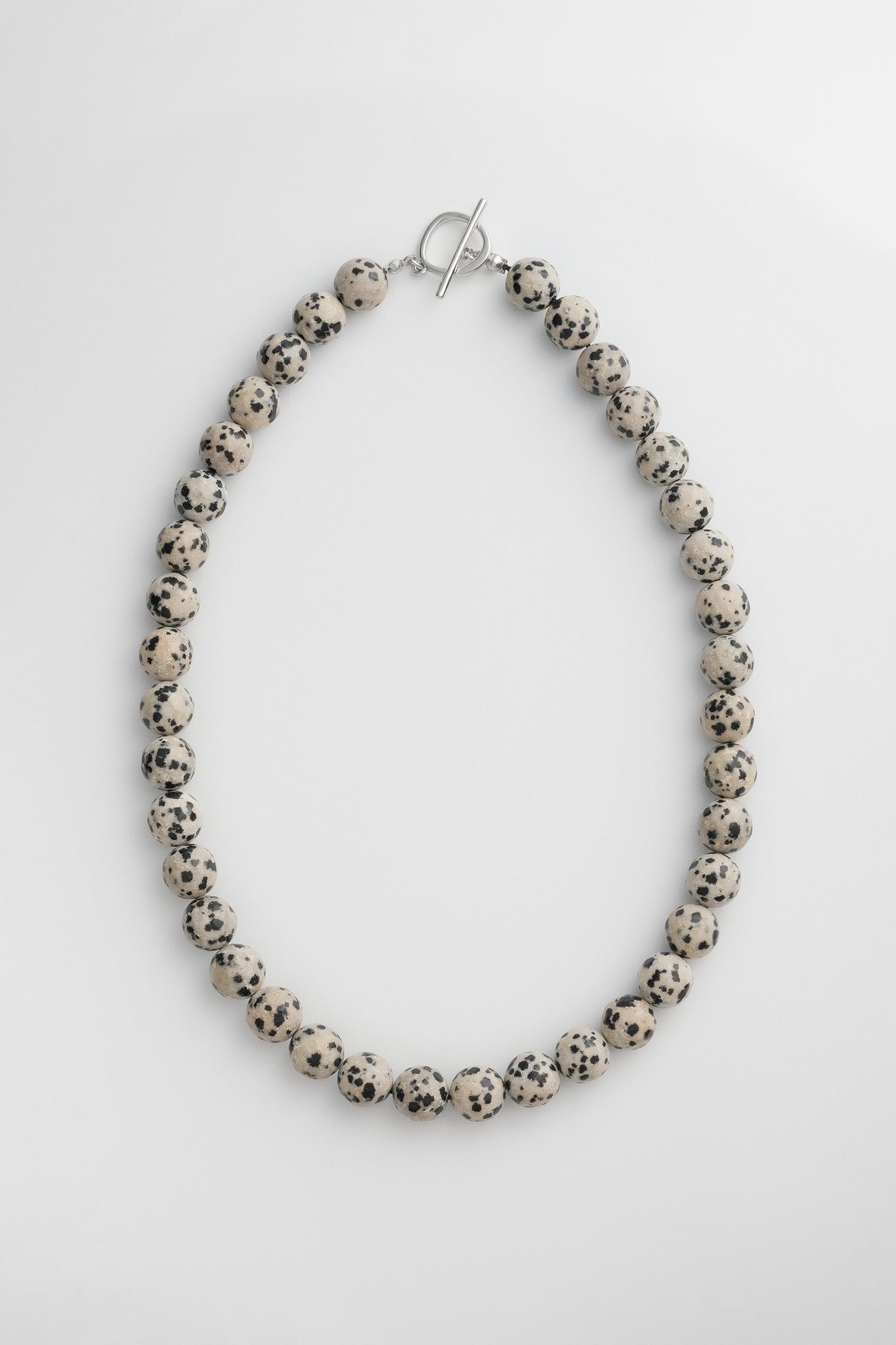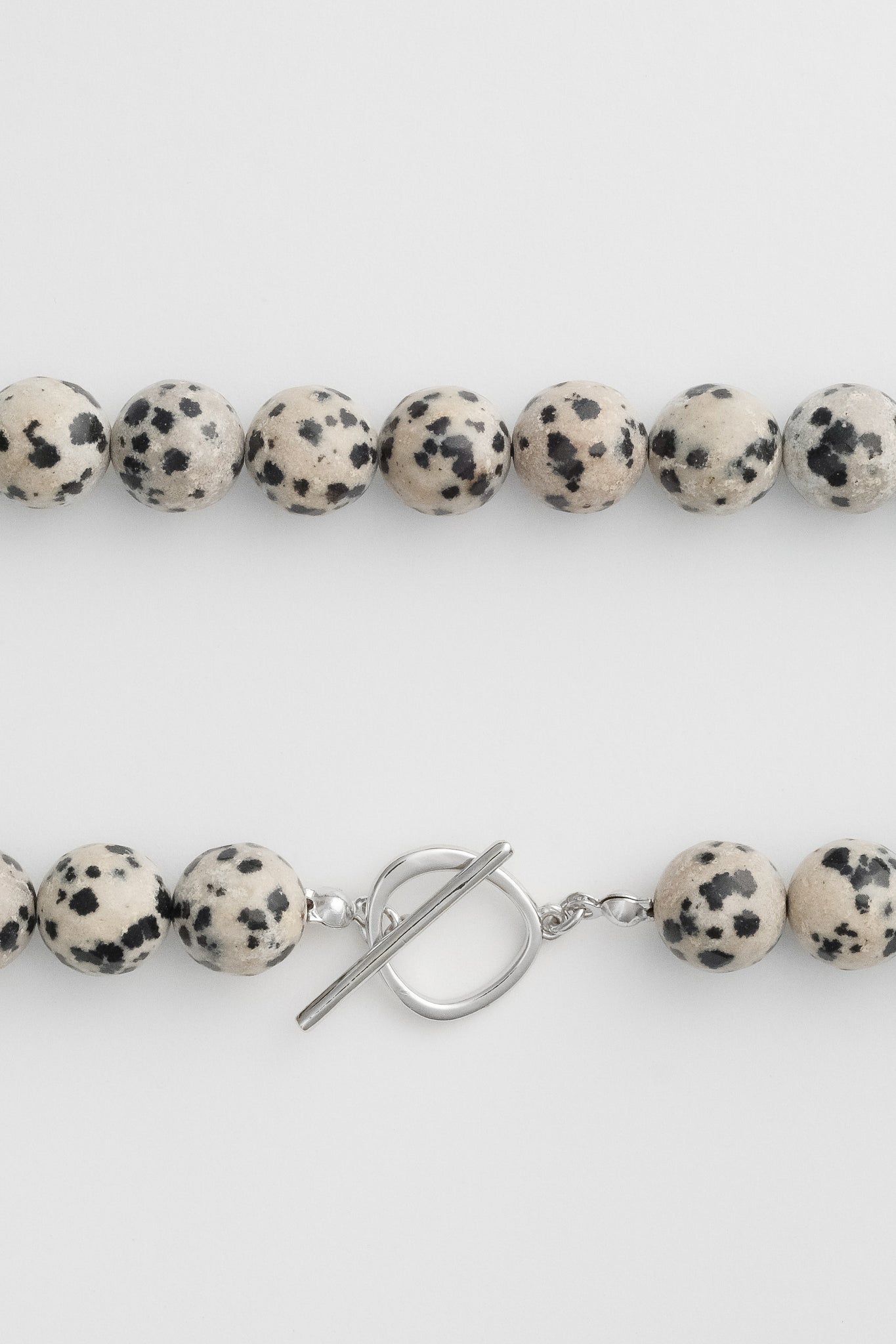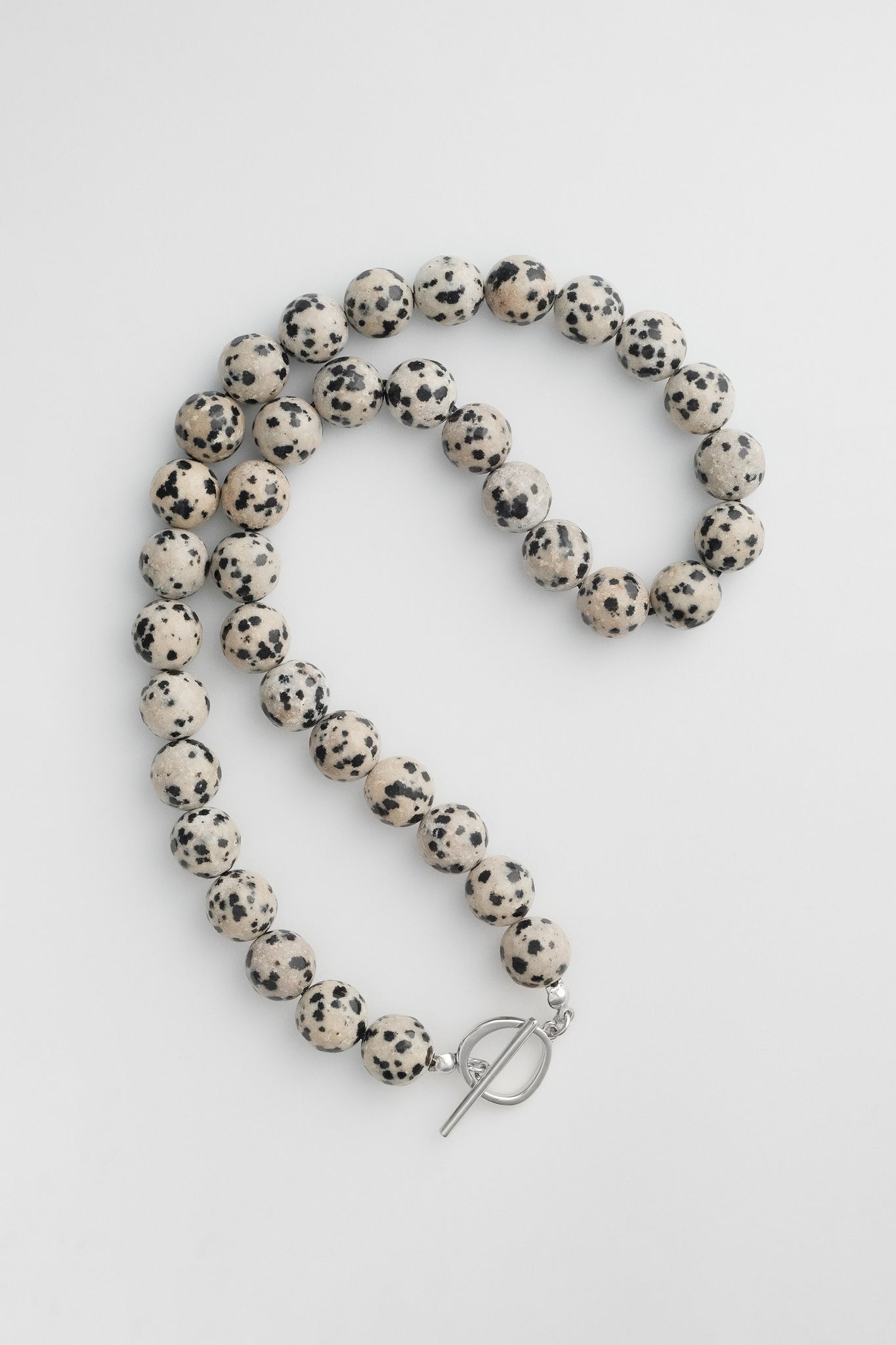 10mm Dalmation Jasper beads, natural and un-dyed, thread by hand on silk. Platinum Plated Brass toggle closure and findings. Lead and cadmium free, nickel safe. Approx 44cm in length.
