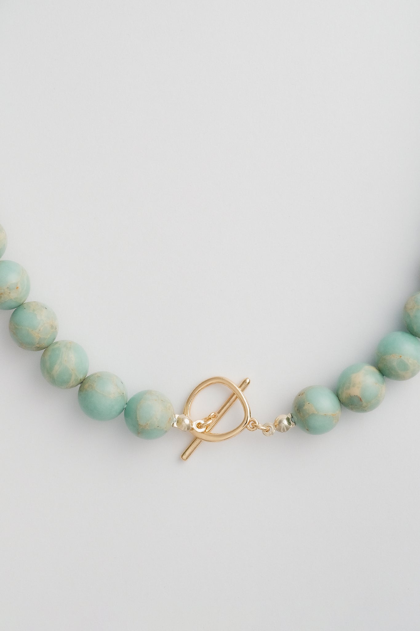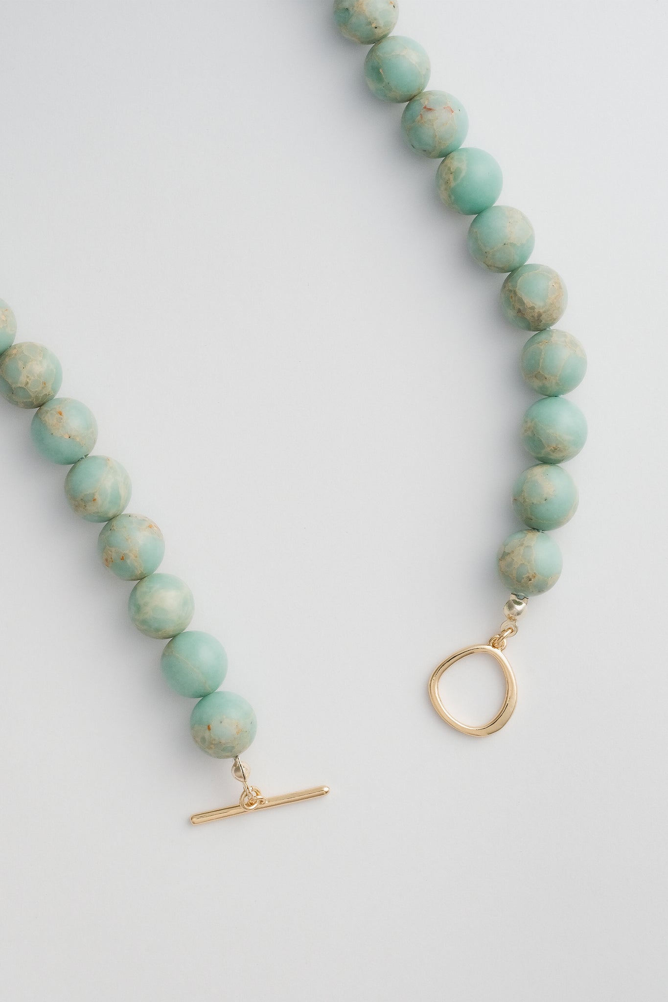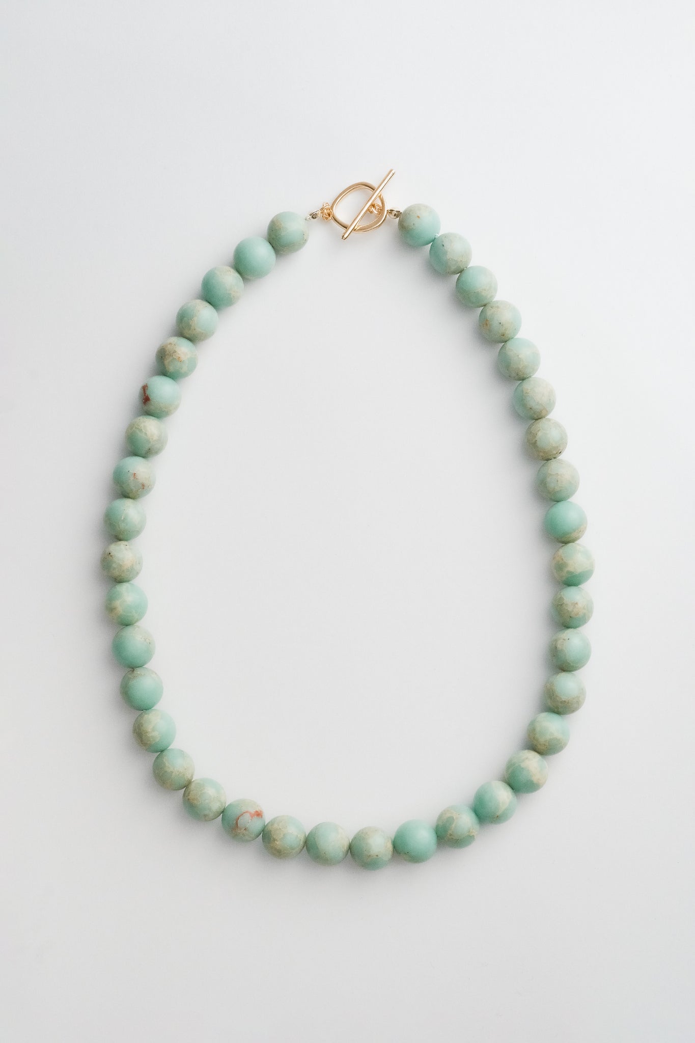 10mm imperial jasper beads, thread by hand on silk. 14K gold-filled toggle closure and findings. Lead and cadmium free, nickel safe. Approx 44cm in length.