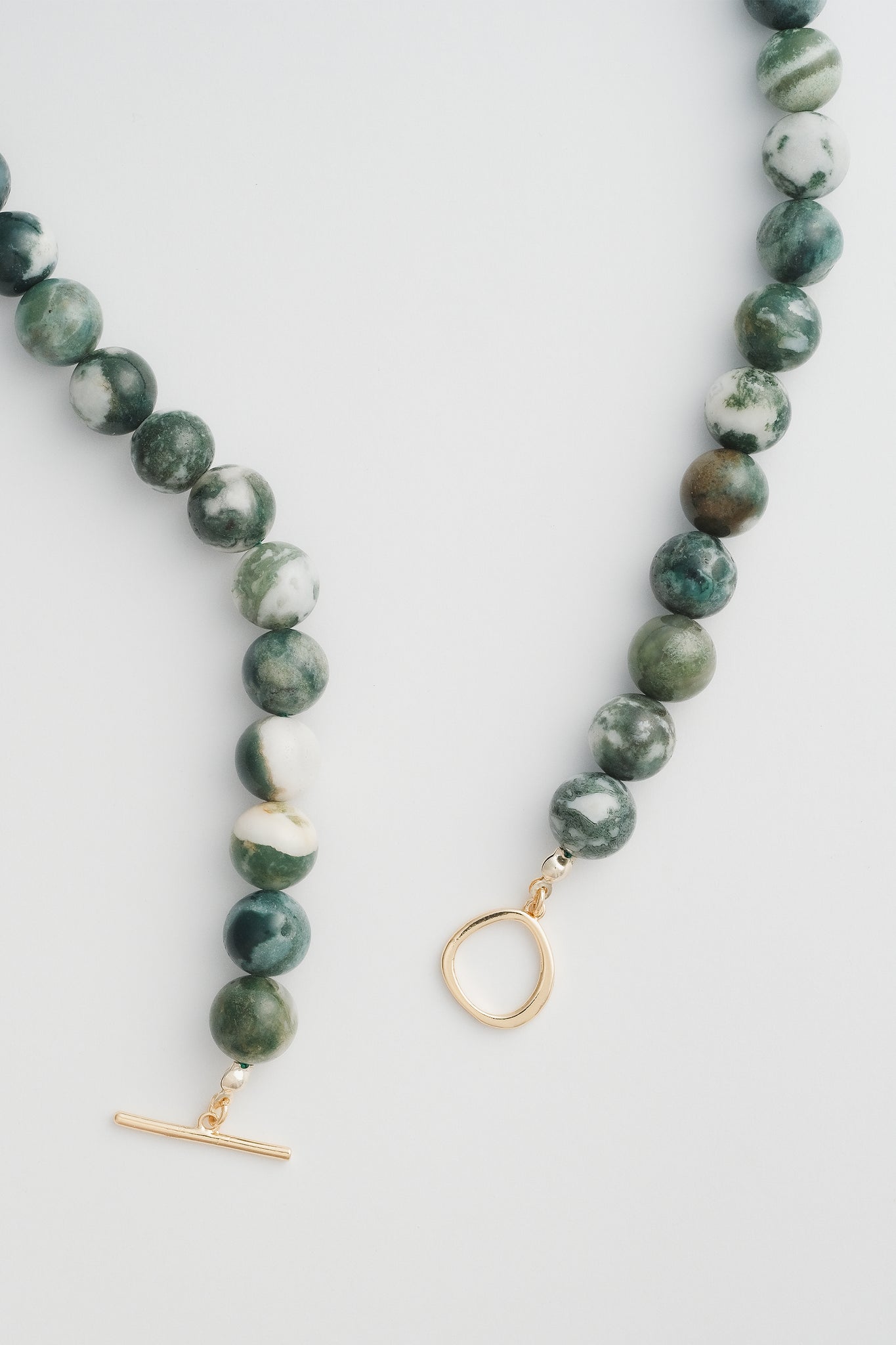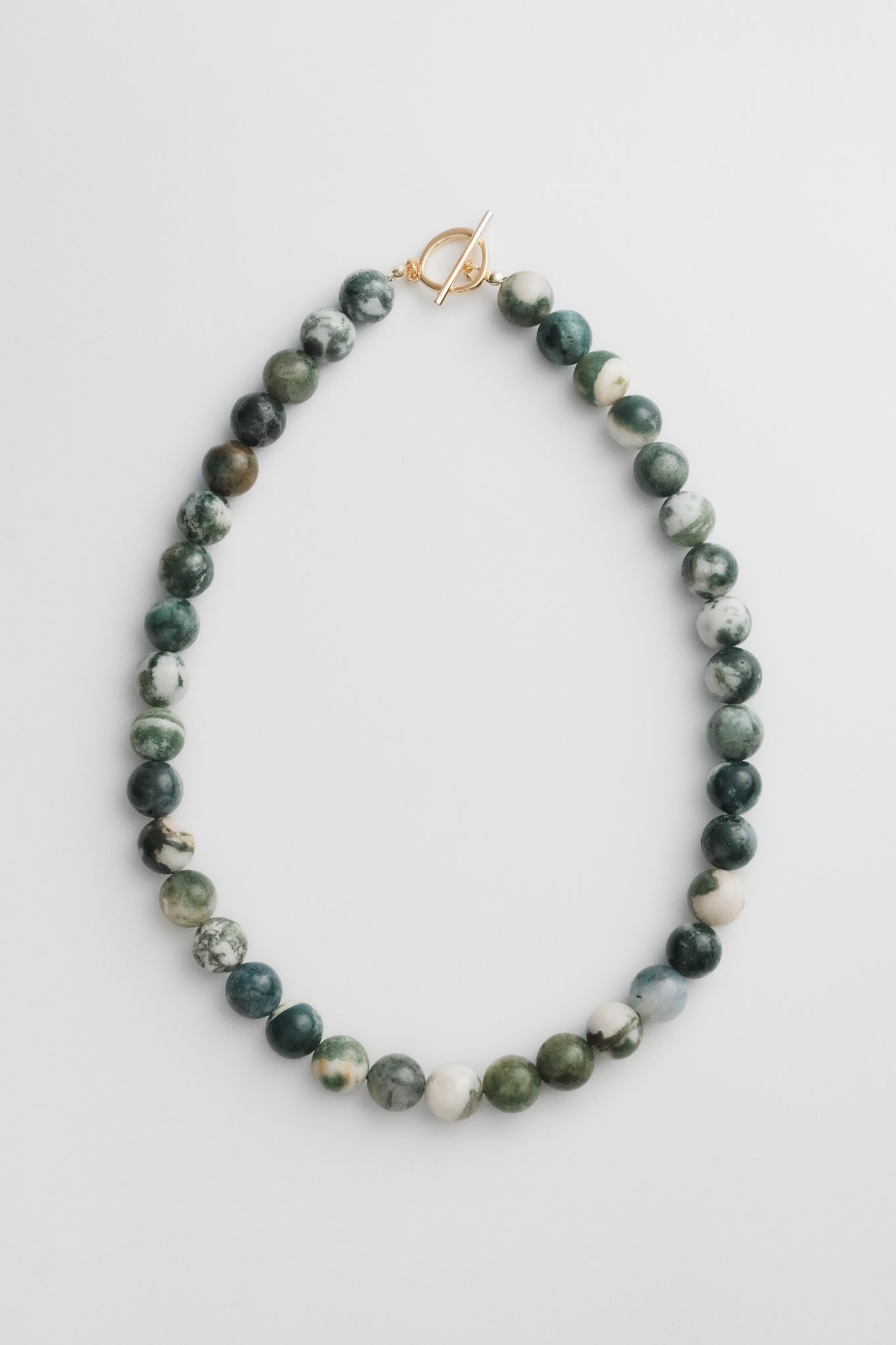 10mm moss agate beads, natural and un-dyed, thread by hand on silk. 14K gold-filled toggle closure and findings. Lead and cadmium free, nickel safe. Approx 44cm in length.