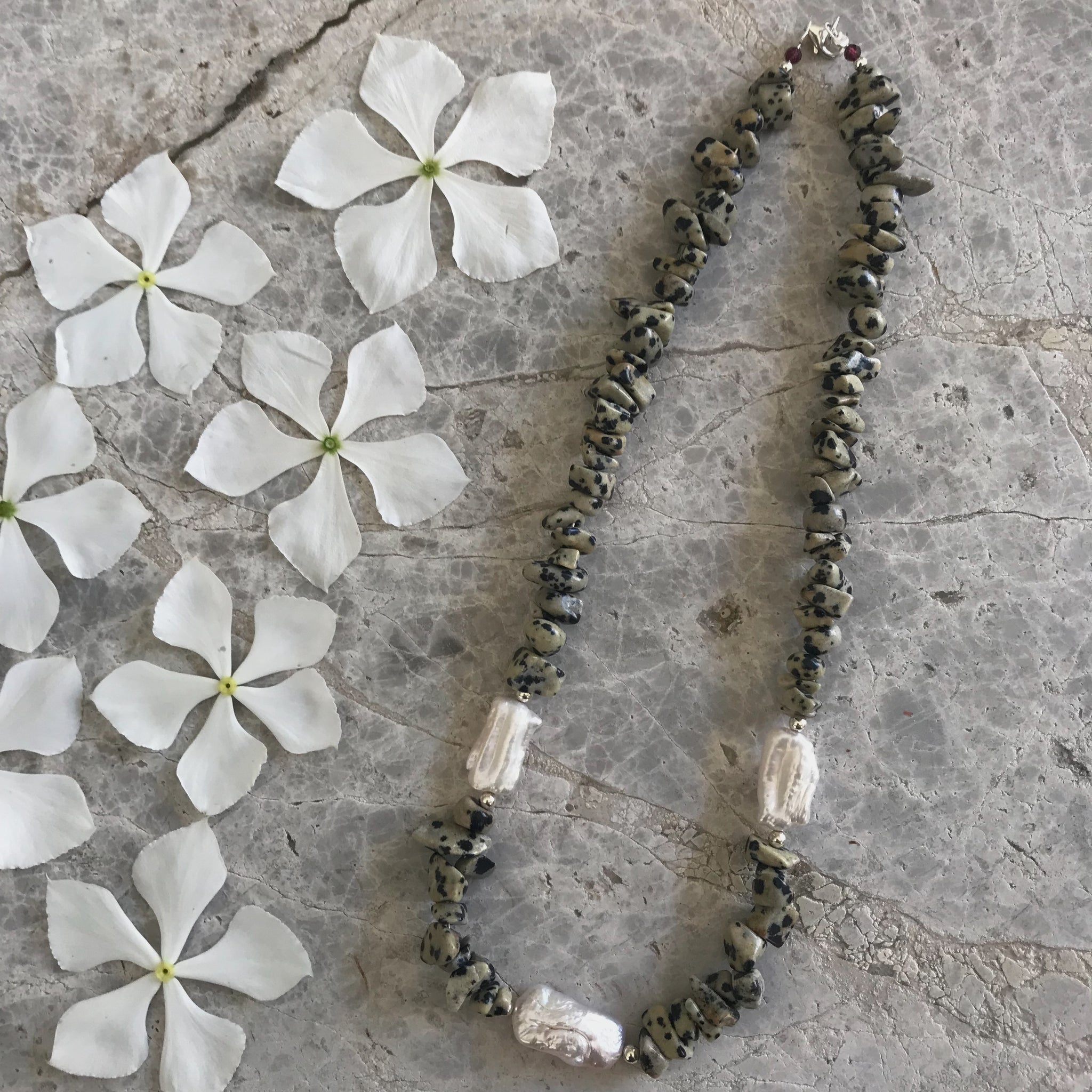 Zali has been carefully handcrafted with contrasting Dalmatian Jasper and luminous Freshwater Keshi Pearls, accented with delicate 14k gold-filled details for an elevated finish.